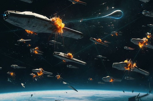 All of these collective flaws come to a head in the space battle. As the probe comes to a halt, the thousand warships line up in formation for the show down. What we get instead is a massacre. Thanks to the Trisolarians' hoodoo physics the probe becomes a wrecking ball that smashes through the engines of the lined up ships, causing them to explode one after the other. Evidently, our descendents had learned nothing from ocean-going navies, let alone three-dimensional space combat video games. Some ships at the margin of the massacre are able to escape and chance it on an escapist, interstellar run. A good job they remembered to pack the cryogenics. But before they do, they butcher each other so the victors have enough supplies and parts to keep them going for a centuries' long voyage. And because of the defeat, everyone on Earth, everyone panics and starts treating Luo as the second coming. They're soon disappointed as he concentrates working on a project ceding the solar system with dust, which will help determine the coordinates of the Trisolarians when they arrive. He's condemned as a fraud while civilisation falls into despondency.